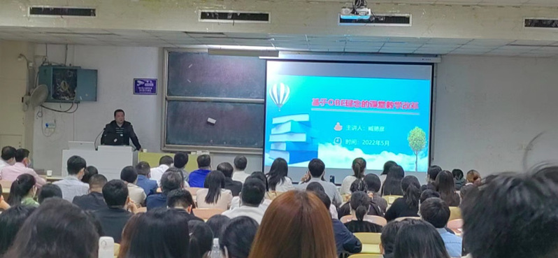 讲座过程中,臧教授为大家详细解读了OBE教育理念的内涵,并从成果导向教育理念出发,结合“反向设计、学生中心、持续改进”三个教学关键,围绕课程体系改革、课堂教学改革与教学评价改革,深入浅出地阐述了“如何把握应用OBE理念”这一问题。在谈到进行课堂教学改革的重要性时,臧教授指出课堂教学应当从目标、需求、过程、评价、改进等五个方面进行课程设计,重构培养方案,形成新的课程体系。同时,强调教师教学要遵循“四个回归”要求,深刻理解学生中心理念,解放课堂,打破课堂教学改革壁垒。