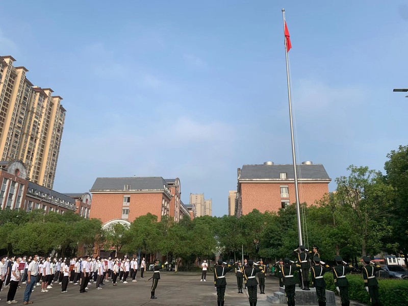 迎着旭日,国旗护卫队员们迈着铿锵有力的步伐护送五星红旗来到升旗台前。庄严的国歌声响起,全场一片肃静,深怀着对国旗的敬意和对祖国的热爱,全体师生行注目礼,鲜艳的五星红旗冉冉升起,迎风飘扬。