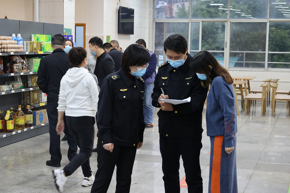 蔡青一行实地检查了学生食堂和教工食堂,参观了厨房和商店,对食堂设备和食物的卫生做了重点检查。