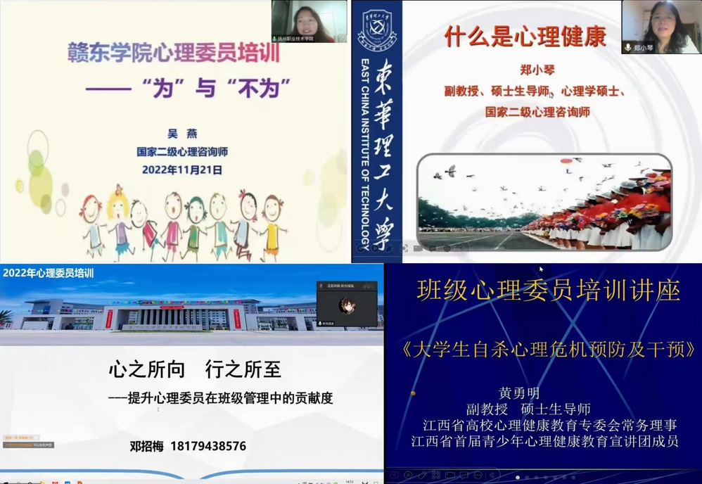 为贯彻落实党的二十大精神,深入推进“健康校园”建设工作,进一步提高疫情期间心理健康工作“主动发现、主动预防、及时干预”的能力,充分发挥朋辈互助的作用,帮助同学们保持健康积极阳光的心态。赣东学院大学生心理健康教育与咨询中心精心谋划,在腾讯会议举办了为期五天的朋辈心理辅导(即班级心理委员和宿舍心灵护航员)线上培训,本次培训时间从11月21号到11月25号,分别邀请了抚州职业技术学院心理中心主任吴燕、抚州幼儿师范高等专科学校心理中心主任邓招梅、东华理工大学抚州师范学院副教授郑小琴、东华理工大学抚州师范学院讲师许惠清以及东华理工大学抚州师范学院副教授黄勇明担任主讲人。