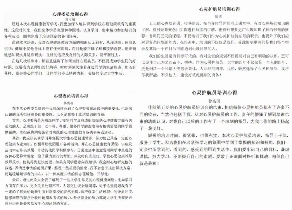 培训结束后,朋辈心理辅导工作者纷纷表示体会颇多。心理委员曾福仁表示:“通过这五次的培训,我对朋辈心理辅导和健康有了更全面的认识。健康不仅仅指的是身体健康,还有心理的健康。大学生活与高中生活不同,甚至可以说是一个巨大的转变,各种问题、烦恼接踵而来,这种时候就需要心理委员心细观察身边的同学,及时发现并帮助他们解决心理问题。”心灵护航员郭承金表示:“我重新认识了心灵护航员这个职位的重要性以及设办心灵护航员的必要性,它不简简单单只代表着一个职位,而是同学们心里的眼睛,老师和辅导员的好助手。”