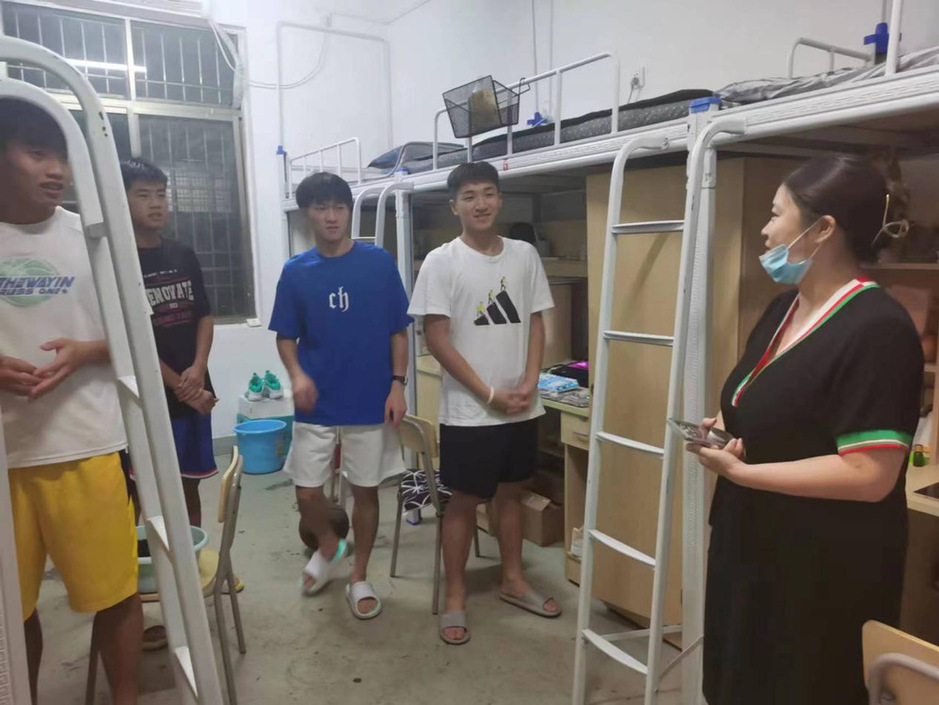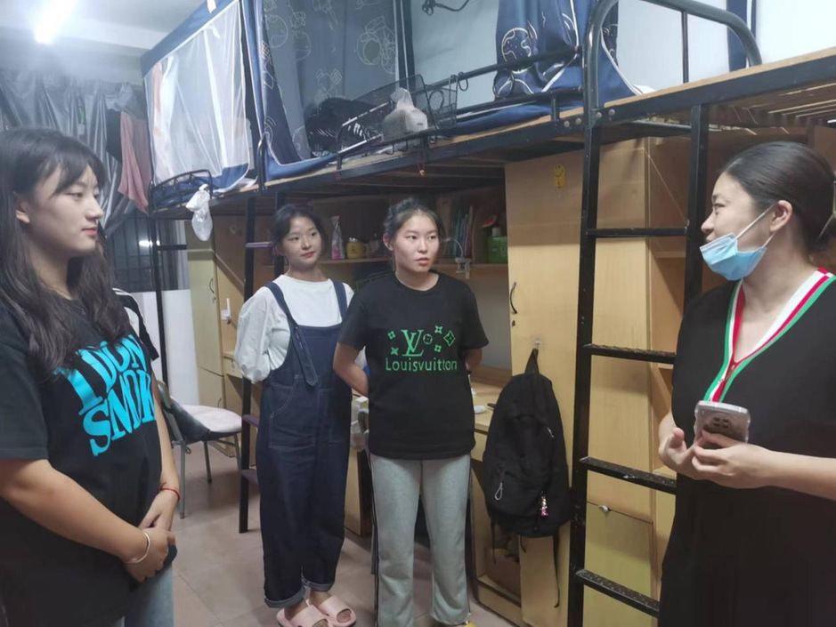 在此过程中,老师们和同学们进行了亲切的交流,关心学生生活状况,疏导学生不良情绪。尤其对新生新进入学校的状况进行了了解,疏导,了解学生的实际困难,帮助学生解决例如床板破损,空调无法开启等实际问题。