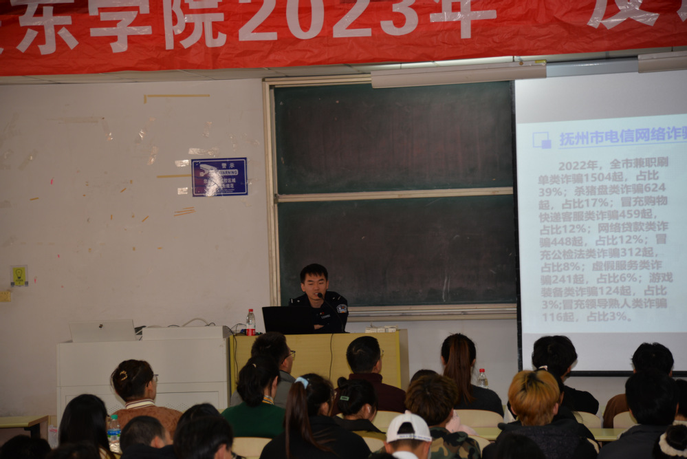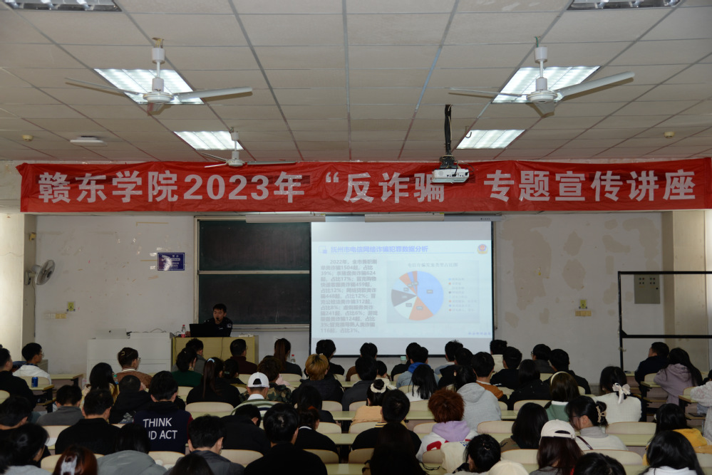 为进一步提升大学生防骗意识和识骗能力,筑牢校园反诈防线,2月21日下午,赣东学院学工处、保卫处和校团委联合组织开展了防范电信网络诈骗犯罪知识讲座,邀请了抚州市公安局反信息网络诈骗中心胥振宇警官来校进行宣讲,200多名教师和学生代表参与聆听。