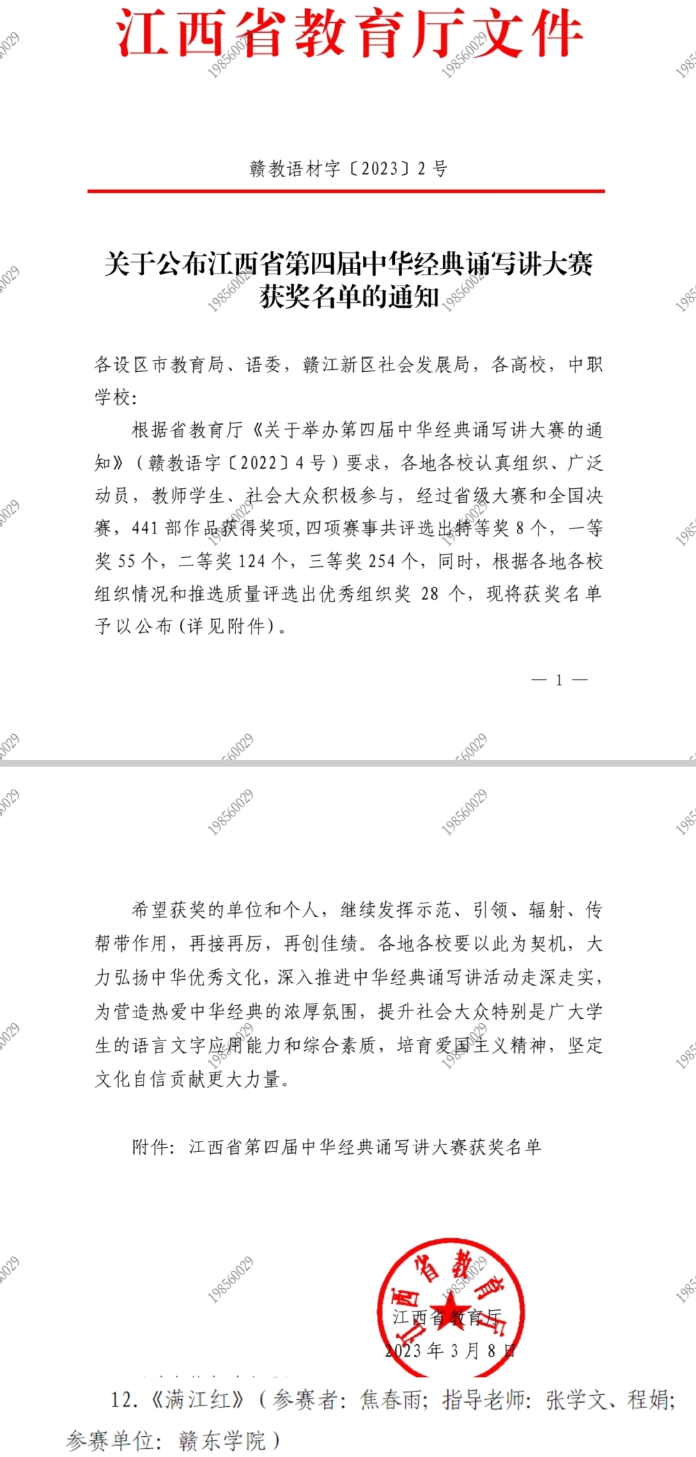 为贯彻落实中共中央办公厅、国务院办公厅《关于实施中华优秀传统文化传承发展工程的意见》和全国语言文字会议精神,全面深入实施中华经典诵读工程,根据《关于举办第四届中华经典诵写讲大赛的通知》(赣教语字〔2022〕4号)要求,我校认真组织、积极动员,师生踊跃参赛。经过省级大赛和全国决赛,我校张学文、程娟老师指导的人文与艺术系汉语国际教育专业学生焦春雨同学荣获省级三等奖,这是我校首次获奖。