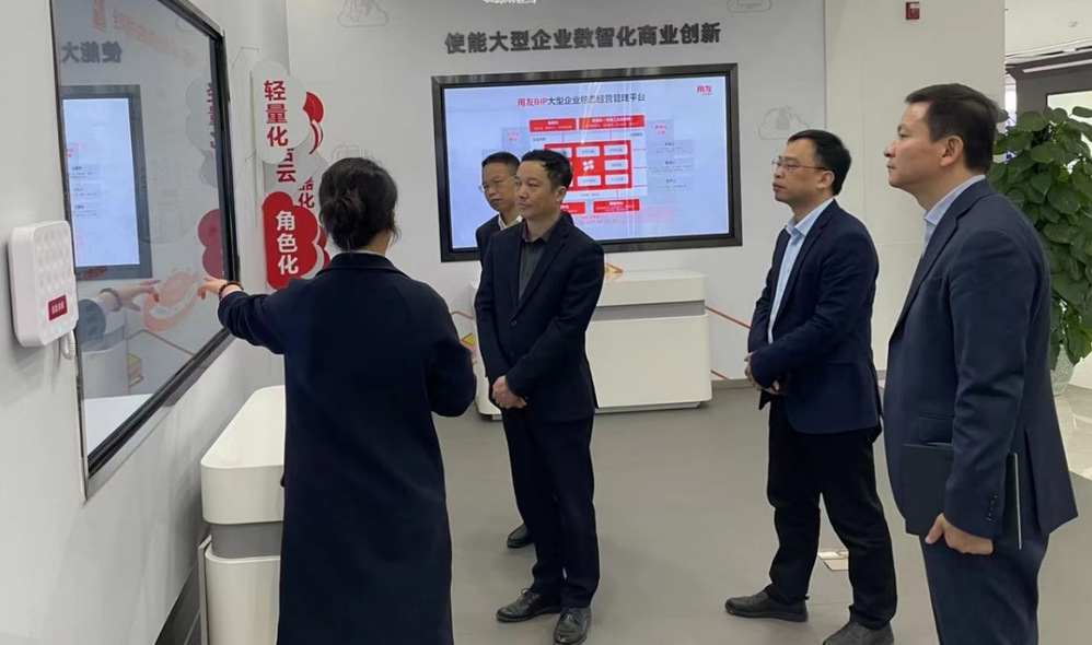 在田鹏的陪同下,陈坚一行参观了北京用友数智企业体验馆,深入了解用友的数字化、智能化服务。围绕企业数智化发展的需求,结合体验馆中金融、教育、政务、制造、建筑、能源、医疗等行业应用场景的展示,田鹏向陈坚一行详细介绍了当前用友集团在数字经济背景下开发的“数字金融”“数字财务”“数字教育”“数字建工”“数字制造”“数字能源”等数字化服务项目,生动地展示了企业数字化的最佳模式和升级路径。
