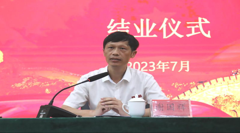 结业仪式上,校领导为全体学员颁发结业证书,为优秀学员颁发荣誉证书,优秀学员代表发言,全体学员在班旗上签字留念。谢国辉作了总结讲话,他指出,此次培训要求标准高、形式新、针对性强、效果好,为全体辅导员补了“钙”、加了“油”、鼓了“劲”。就学工战线如何弘扬井冈山精神做好新时代学工工作,他提出了四点要求:一是强化党性锤炼,坚定执着追理想;二是强化创新创造,实事求是闯新路;三是强化问题导向,艰苦奋斗攻难关;四是强化精细服务,依靠群众求胜利。希望全体辅导员把跨越时空的井冈山精神转化为工作动力,内化于心、外化于行,为推进学院高质量发展贡献自己的绵薄之力。结业仪式在激昂的国际歌声中圆满落下帷幕。