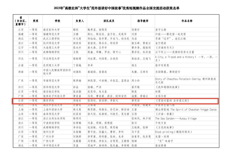 9月23日,第二届“高教社杯”大学生“用外语讲好中国故事”优秀短视频全国交流活动在南京大学(苏州校区)成功举行。人文与艺术系英语专业汤海乐学生团队作品《赏指间錾刻 品非遗之韵》获全国一等奖。