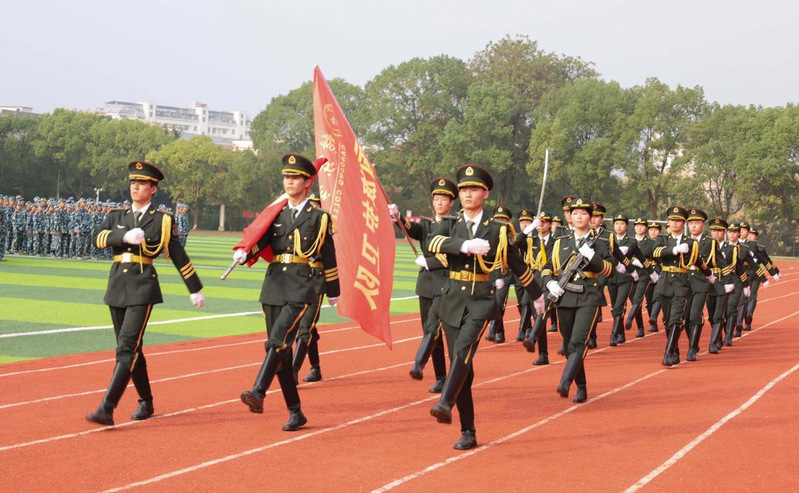 校党委副书记陈克胜讲话,党委委员、副院长茶金学主持,抚州军分区副司令胡伟龙,全体在家校领导,各系部负责人,教师代表,2023级全体新生、教官参加。