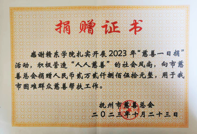 在“慈善一日捐”活动中,校领导班子成员率先垂范,广大教职员工积极响应,大家主动为慈善公益事业献出自己的爱心,以实际行动支持抚州公益事业的发展。活动本着“依法组织、公开透明、坚持自愿、鼓励奉献”的组织原则,先后有299位教职工参加,共筹集善款22850元。慈善捐款活动所筹善款现已全部上交市慈善总会。