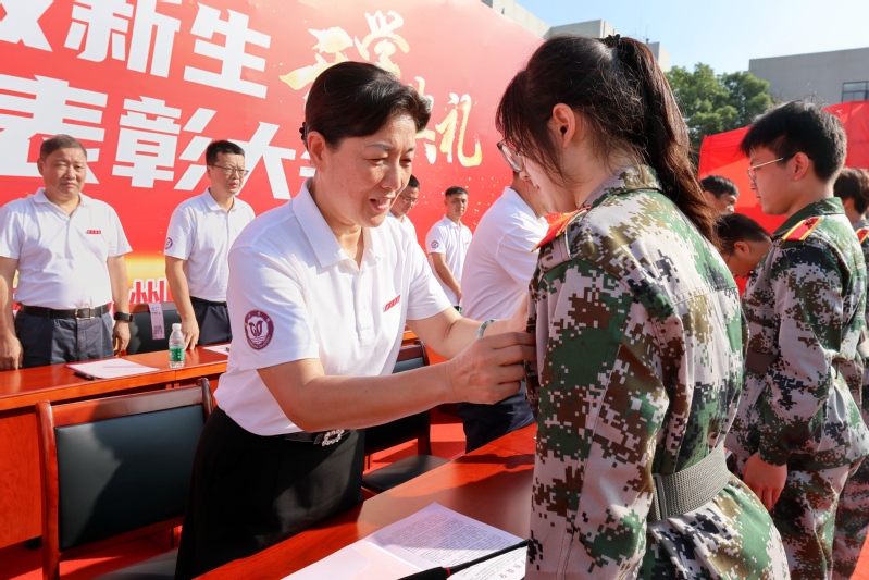 校领导为新生代表佩戴校徽,新生辅导员代表和全体新生现场宣誓。
