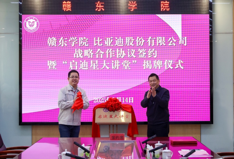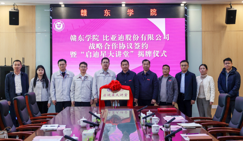 3月14日上午,赣东学院与比亚迪集团战略合作协议签约暨“启迪星大讲堂”揭牌仪式在明德楼隆重举行。校党委副书记、校长刘云海,比亚迪集团人力资源处蓝领招聘部总监兼华中区总监蒋平出席仪式并为共建“启迪星大讲堂”揭牌。副校长李勋与比亚迪集团总裁办行政部副总监邹杨分别代表双方签署战略合作协议。比亚迪集团抚州园区人事经理万有达、招聘主管肖青以及学校相关部门负责人参加。