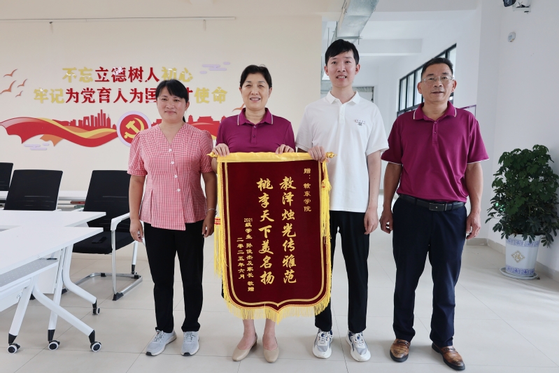 6月9日上午,赣东学院机械与电子工程学院2021级自动化专业毕业生孙俊杰及其家长为学校赠送了一面锦旗,以此表达对学校浓浓的感恩之情。校党委书记陈克胜,党委委员、副校长茶金学热情迎接并接收敬赠。