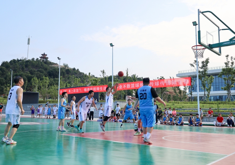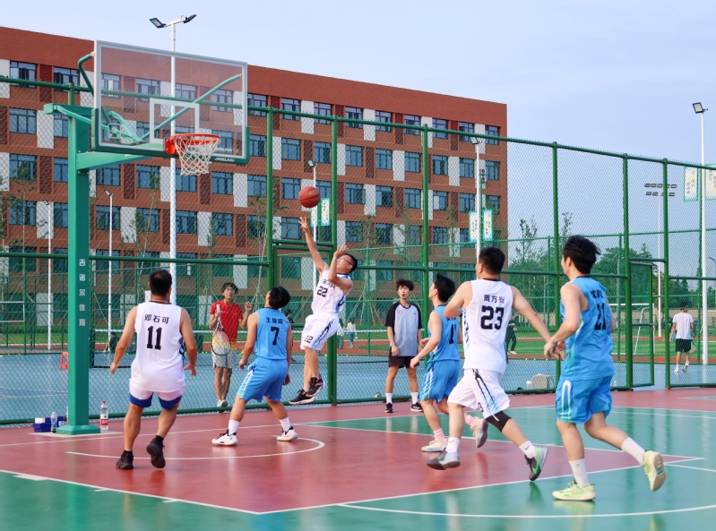 球场上,青春的活力与成熟的稳重激情碰撞。毕业生们身姿矫健,步伐灵动,如猎豹般穿梭在球场各处,积极拼抢、巧妙运球、精准投篮,展现出扎实的球技与对胜利的渴望。教师代表们也不甘示弱,凭借丰富的经验和默契的配合,一次次化解对方的进攻,并寻机反击。校长们更是亲自上阵,他们的参与点燃了全场热情,每一次触球、每一次奔跑都赢得阵阵欢呼。观众席上,同学们的热情如烈火烹油,呐喊声、助威声此起彼伏,“加油!”“好球!”的喝彩声震耳欲聋,整个操场变成了一片欢乐的海洋。