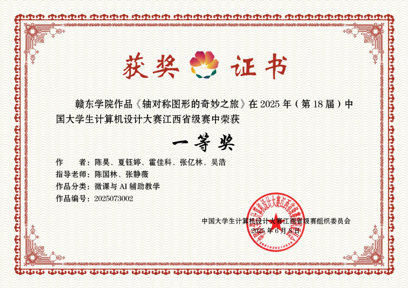 近日,2025年(第18届)中国大学生计算机设计大赛江西赛区获奖名单揭晓,我校学子经过激烈角逐,共获得一等奖1项、二等奖3项、三等奖7项,参赛作品《轴对称图形的奇妙之旅》入选全国决赛。