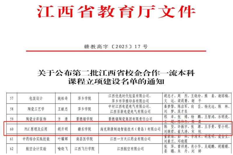 近日,省教育厅下发了《关于公布第二批江西省校企合作一流本科课程立项建设名单的通知》,我校胡开明教授课程团队申报的《PLC原理及应用》课程获批立项,实现此类课程省级立项零突破。据悉,本次申报项目经过严格评审,从全省本科高校推报的199门课程中,择优遴选62门课程立项建设。