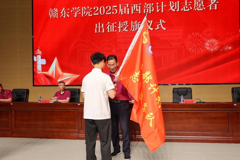 茶金学为西部计划志愿者代表授旗并赠送出征纪念品。