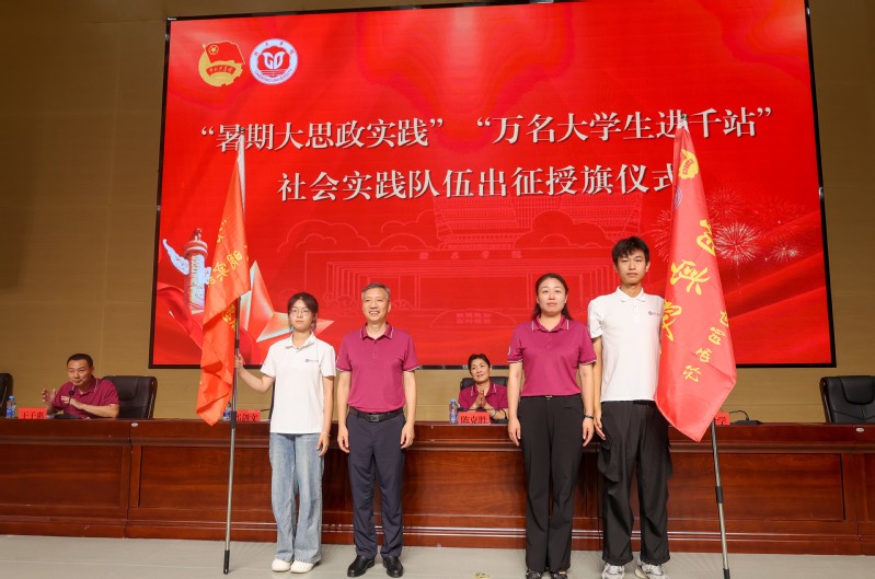 校党委宣传统战部负责人为“暑期大思政实践”出征队伍授旗。校党委学生工作部部长为“万名大学生进千站”出征队伍授旗。