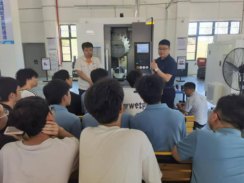在五轴加工中心培训专场,沈阳机床的工程师凭借其丰富的实战经验,从五轴加工中心的基本构造和工作原理讲起,逐步深入到复杂零件的加工工艺、编程技巧以及设备的日常维护与故障排除。工程师结合实际案例,详细演示了操作流程,对关键步骤进行了反复强调和耐心讲解。参训的老师和学生们听得聚精会神,不时在笔记本上记录要点,遇到疑问及时向工程师请教,工程师也都一一细致解答,现场互动氛围十分浓厚。