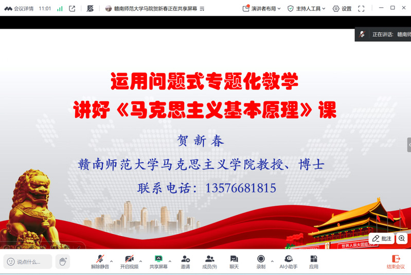 为进一步推进我校思政课问题式专题化团队教学改革,切实提升思政课的教学质量与育人实效,10月25日,马克思主义学院特邀赣南师范大学马克思主义学院院长贺新春教授开展学术讲座。马克思主义学院院长邹志坚主持,马克思主义学院全体教师参加。