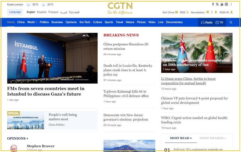 据了解,中国国际电视台(CGTN),是中央广播电视总台所属的中华人民共和国面向全球播出的新闻国际传播机构 。中国国际电视台以中国视角看世界,让世界“See the difference(看到不同)”。
