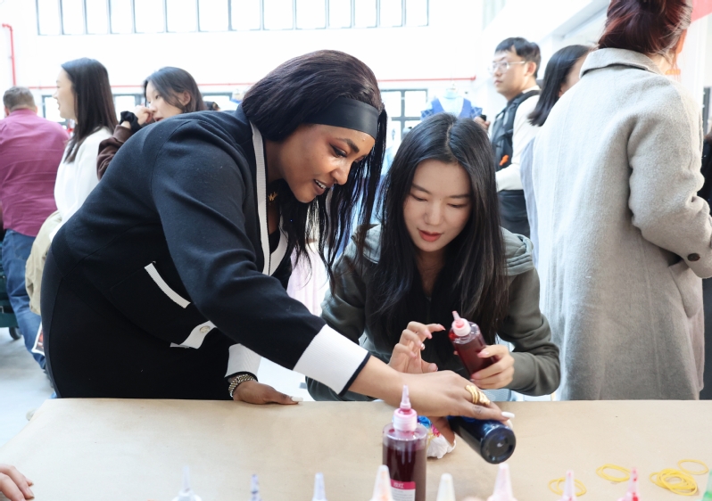 本次展览由人文学院承办,内容涵盖扎染、国画、剪纸、漆扇、绒花和古筝等非遗技艺。来自不同国家的参观者通过亲身感受、亲手制作等互动体验形式,深入了解了中国手工艺的独特魅力。
