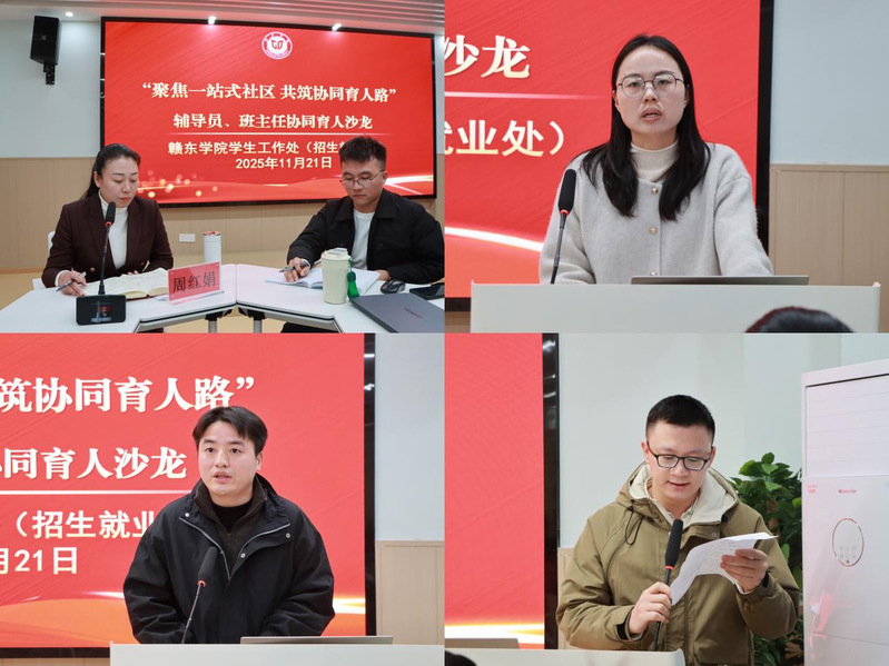 为深入贯彻党的二十届四中全会精神,扎实落实立德树人根本任务,进一步推进“一站式”学生社区建设,凝聚育人共识,11月21日上午,赣东学院成功举办以“聚焦一站式学生社区共筑协同育人路”为主题的辅导员班主任协同育人沙龙。党委学生工作部部长周红娟,各学院学团办主任、全体辅导员及班主任代表参加活动。