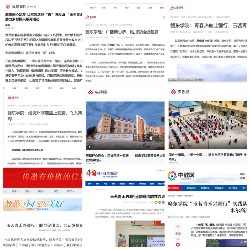 活动期间,团队实践成果受到社会各界广泛关注,被央视频、中教网、中国网、凤凰新闻、江西新闻等国家级、省级媒体平台报道百余次。除共青团新疆区委的感谢信外,团队还收到来自阿克陶前方指挥部、阿克陶县教育局、阿克陶镇政府、雪松中学、新疆阿克猫农业开发有限公司等共12家单位的感谢信。