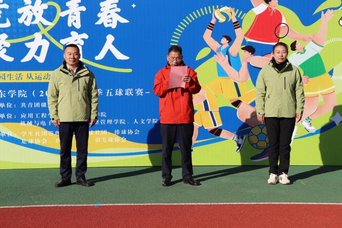 11月29日上午,赣东学院“竞放青春 聚力育人”2025年冬季“五球联赛”开幕式在学校西操场举行。校党委委员、副校长茶金学出席并致辞。党委学生工作部、校团委负责人,各二级学院分团委书记,参赛运动员,裁判员及师生代表300余人参加。