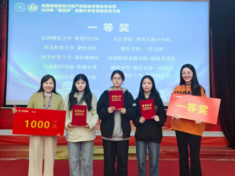 11月29日,2025年“衡信杯”全国大学生智慧税务大赛(第十一届)总决赛在江西财经大学举行。赣东学院经济管理学院会计学专业学生团队获全国一等奖1项、省级三等奖1项。