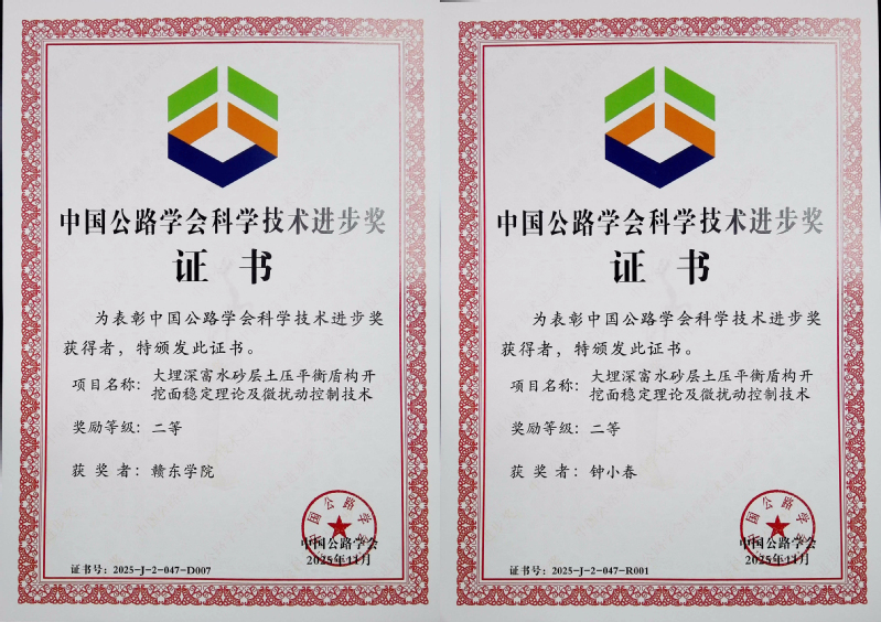 12月1日,中国公路学会科学技术奖颁奖大会在厦门举行,赣东学院钟小春教授主持完成的“大埋深富水砂层土压平衡盾构开挖面稳定理论及微扰动控制技术”成果获中国公路学会科学技术进步二等奖。
