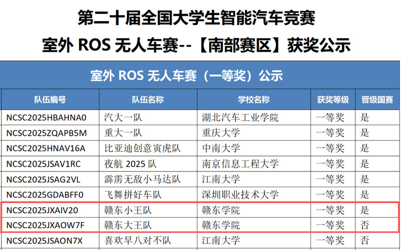 近日,在南京信息工程大学举行的2025年第二十届全国大学生智能汽车竞赛(南部赛区)中,赣东学院机械与电子工程学院学子组成的2支队伍,获南部赛区一等奖2项(指导老师徐涢基、徐鑫、王孚贵)。