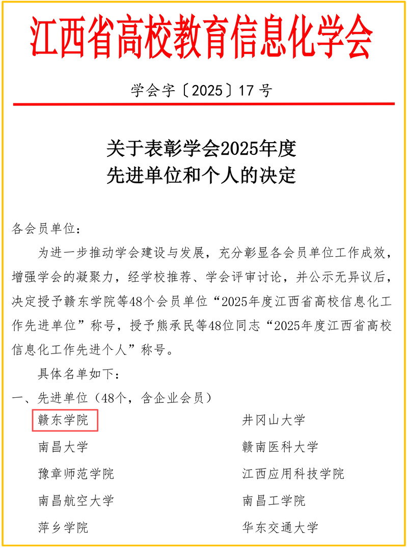 12月27日,在江西省高等教育信息化学会学术年会上,赣东学院获评2025年度江西省高校信息化工作“先进单位”,网络与信息中心熊承民同志荣获“先进个人”称号。