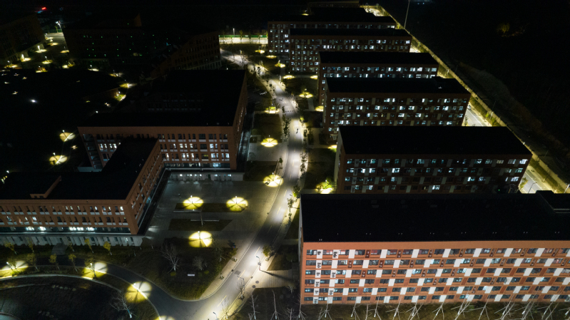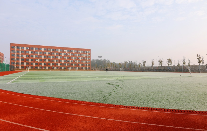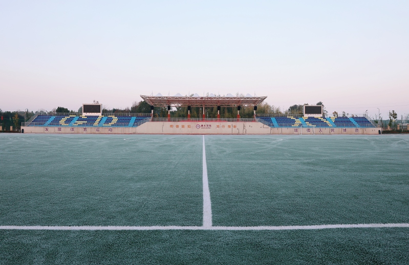 赶早的学生踏过足球场、水上栈道