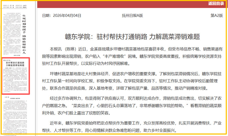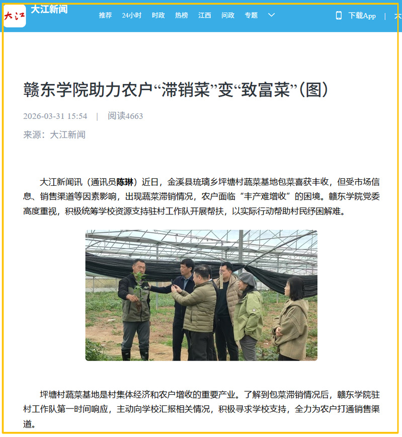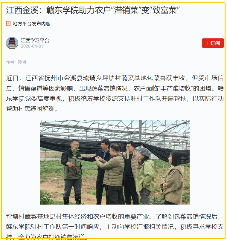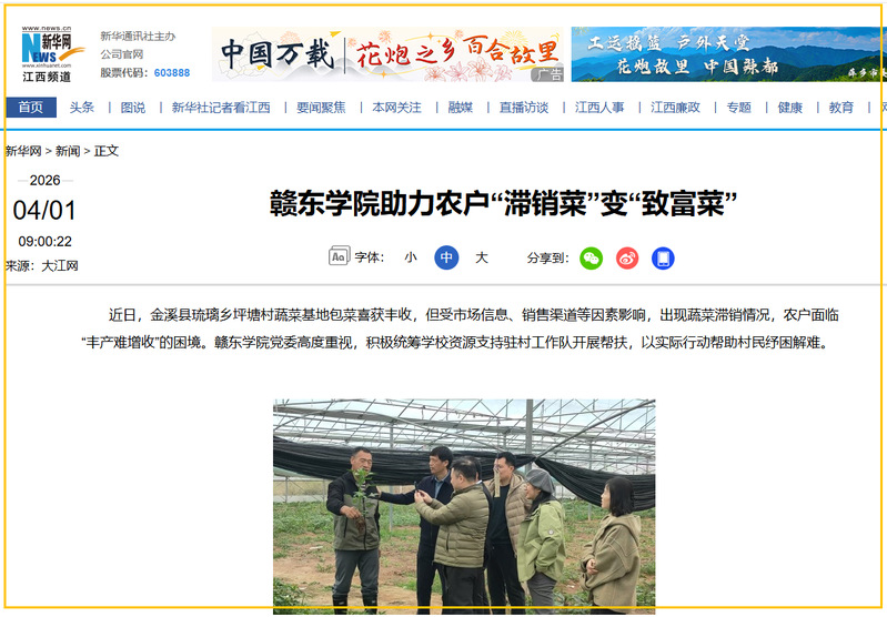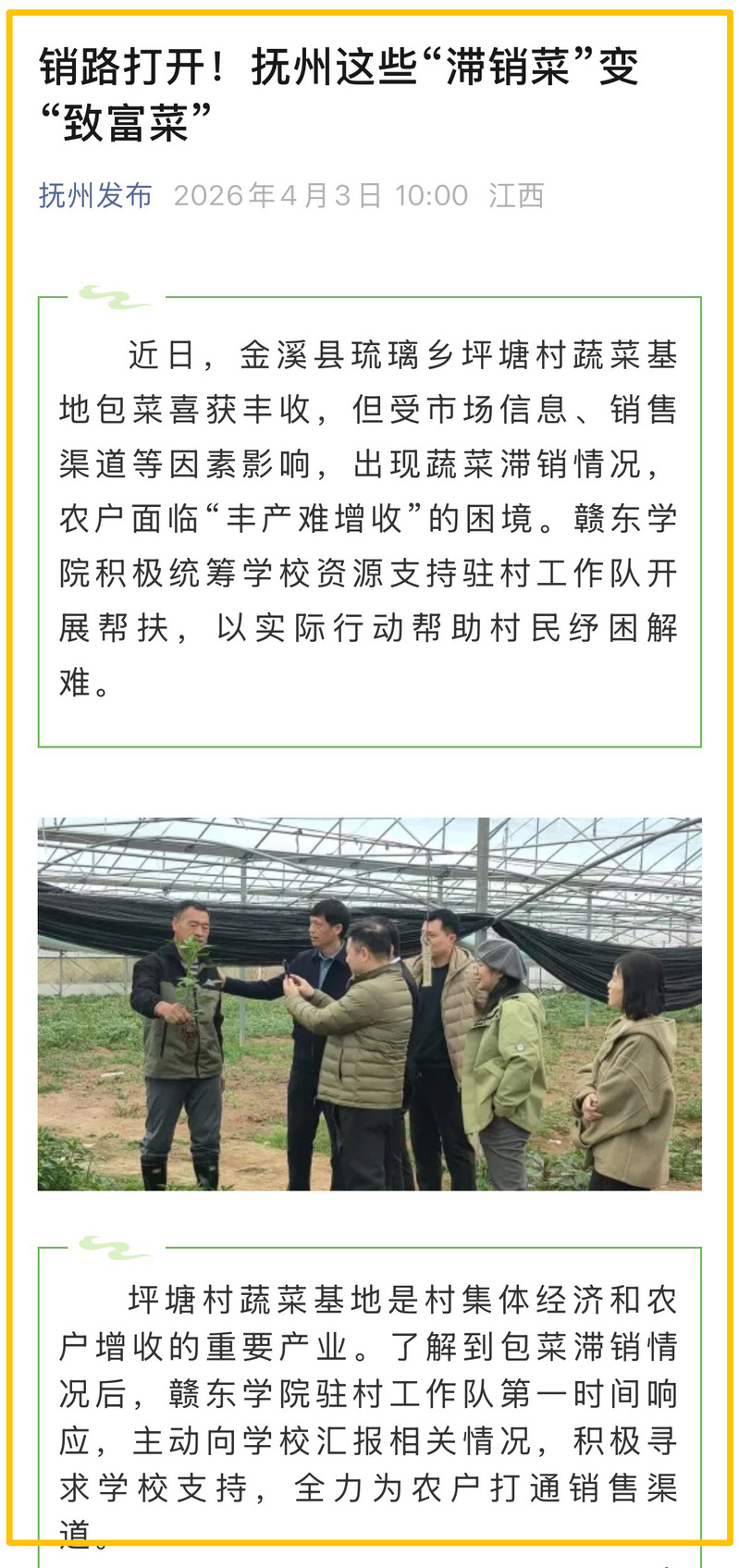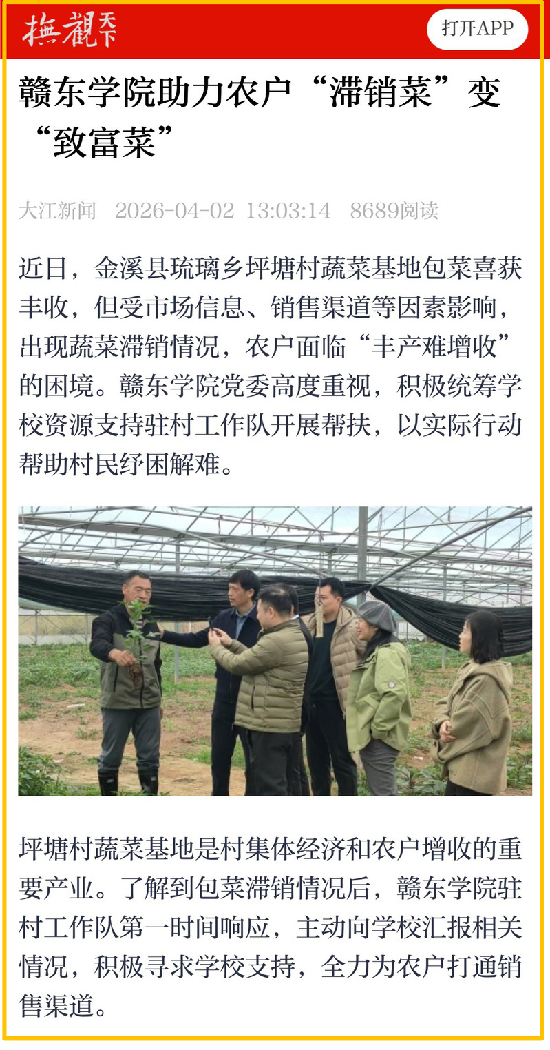 近日,一场“滞销菜”变“致富菜”的暖心行动在金溪县琉璃乡坪塘村生动上演。赣东学院驻村工作队扎根田间,精准对接,不仅帮助农户打通了包菜的销售渠道,更在乡村振兴一线书写了高校担当。新华网、学习强国平台、抚州发布、抚州日报等主流媒体相继聚焦,让这份来自田间地头的温暖,跨越山水,感动人心。